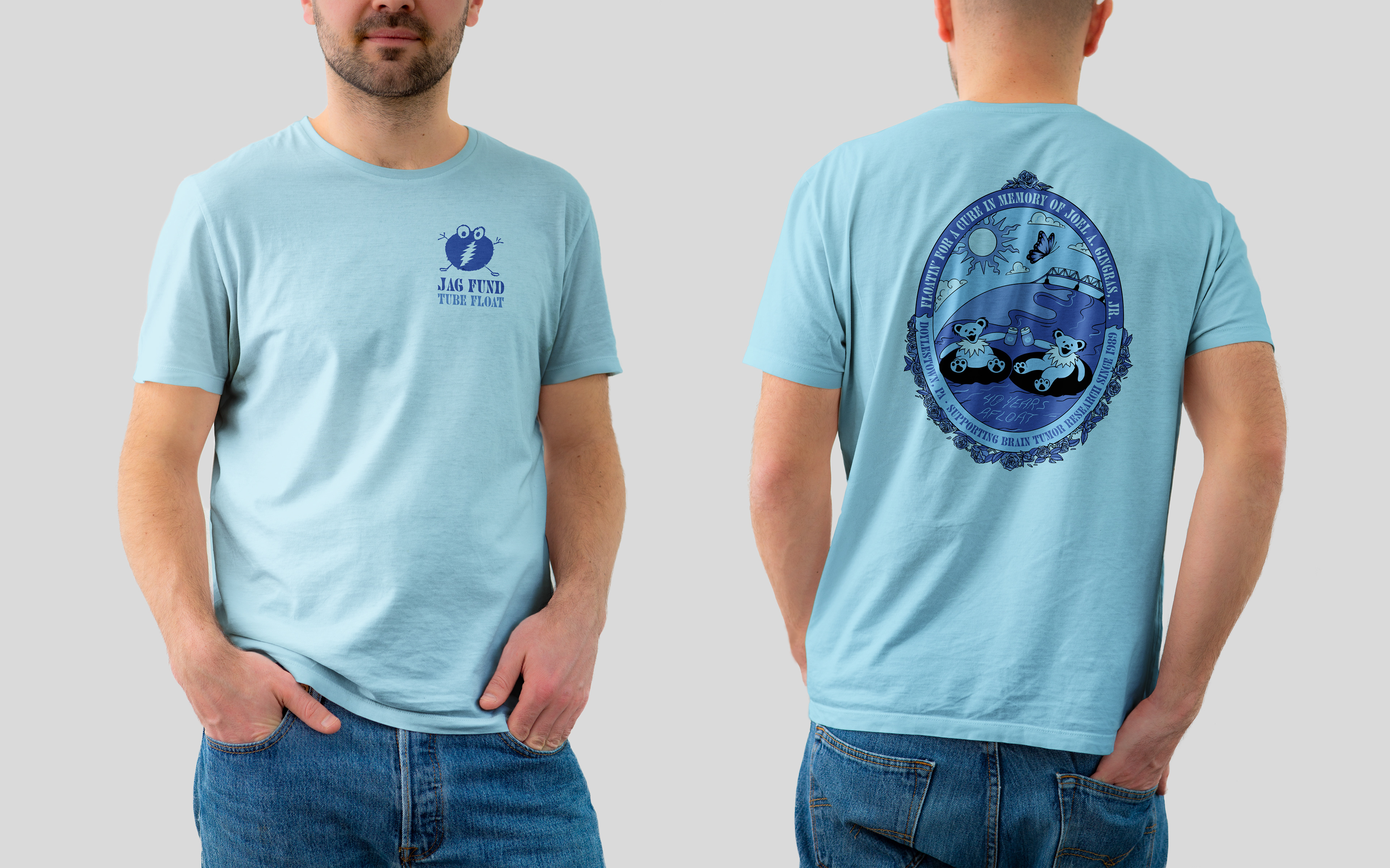 Joel was a major Deadhead, so I wanted to make sure to include the Grateful Dead somehow in this year's shirt design. I decided to take the grateful dead dancing bears and put them in little inner tubes! The bridge in the background is the bridge that my dad and Uncle would jump off of for fun before the float. One day, while they were jumping off the bridge, my dad and uncle said "hey, those people tubing look like they're having a lot of fun!" And from then on, they went tubing ever year.